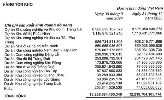 Tổng Công ty Phát triển Đô thị Kinh Bắc - CTCP (HOSE: KBC) đứng thứ 2 với lượng tồn kho tăng 8%, lên hơn 13.2 ngàn tỷ đồng; tập trung nhiều nhất tại dự án khu công nghiệp và khu đô thị Tràng Cát hơn 8.3 ngàn tỷ đồng (chiếm 64%); dự án khu đô thị Phúc Ninh hơn 1.1 ngàn tỷ đồng (chiếm 8%); dự án khu công nghiệp Tân Phú Trung gần 987 tỷ đồng; dự án nhà ở xã hội thị trấn Nếnh gần 860 tỷ đồng …