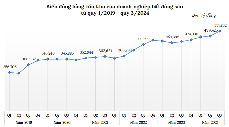 Tổng giá trị hàng tồn kho của các doanh nghiệp bất động sản trên sàn tiếp tục tăng cao, tại thời điểm cuối quý 3 vượt hơn 530 ngàn tỷ đồng, mức cao nhất từ trước tới nay.