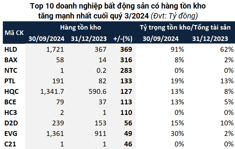 Ngoài HLD, CTCP Thống Nhất (HNX: BAX) có tồn kho tăng đột biến lên 58 tỷ đồng, gấp gần 4.2 lần so với đầu năm; toàn bộ là giá trị căn hộ nhà công nhân và các công trình giáo dục, thương mại dịch vụ đã hoàn thiện thuộc dự án phát triển nhà ở khu trung tâm dịch vụ khu công nghiệp Bàu Xéo đang chờ bán.