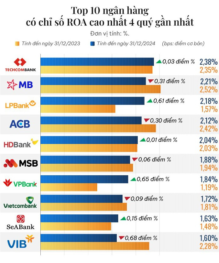 TOP 10 ngân hàng có ROA cao nhất năm 2024: Techcombank dẫn đầu, VPBank và LPBank tăng mạnh nhất