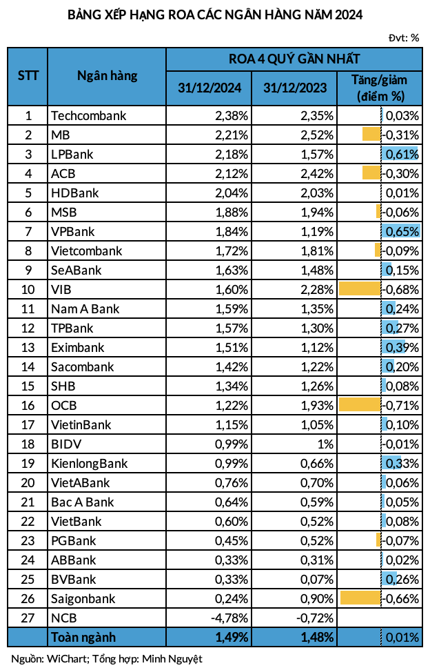 Theo số liệu Wichart tổng hợp từ báo cáo tài chính các ngân hàng niêm yết, chỉ số ROA (Return On Asset) - tỷ suất sinh lời của tài sản, đã có sự phục hồi nhẹ so với cuối năm 2023. ROA của ngành ngân hàng (gồm 27 nhà băng) đã tăng 0,01 điểm %, đạt 1,49% vào cuối quý IV/2024.
