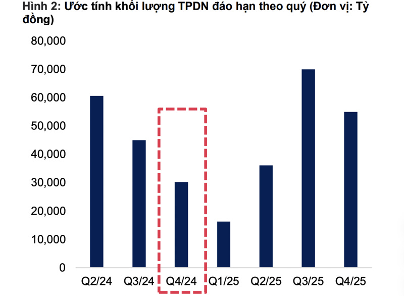 Áp lực đáo hạn sẽ gia tăng dần và đạt đỉnh vào Quý 3/2025 với lượng trái phiếu doanh nghiệp đáo hạn lên tới khoảng 70 nghìn tỷ đồng gấp khoảng 1,6 lần so với cùng kỳ...