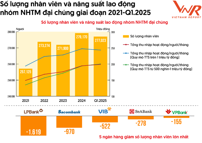 Riêng trong quý I/2025, số lượng nhân sự toàn ngành giảm 2.147 người. Việc này phản ánh định hướng chuyển dịch trọng tâm sang nền tảng số, đồng thời giúp kiểm soát chi phí vận hành trong bối cảnh cạnh tranh gia tăng.