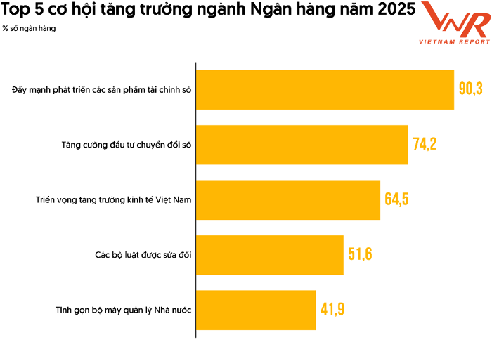 Theo khảo sát của Vietnam Report, 5 cơ hội tăng trưởng giúp ngành ngân hàng có dư địa lớn để phát triển bao gồm đẩy mạnh phát triển các sản phẩm tài chính số, tăng cường đầu tư chuyển đổi số, triển vọng tăng trưởng kinh tế Việt Nam, các bộ luật được sửa đổi và tinh gọn bộ máy quản lý Nhà nước.