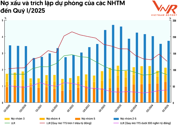 Tỷ lệ bao phủ nợ xấu (LLR) chưa phục hồi về mức an toàn, đặc biệt là tại nhóm ngân hàng có tổng tài sản dưới 300.000 tỷ đồng, nơi LLR vẫn dưới 40%. Trong khi đó, nhóm ngân hàng lớn duy trì LLR trên 125% nhưng có dấu hiệu suy giảm nhẹ.