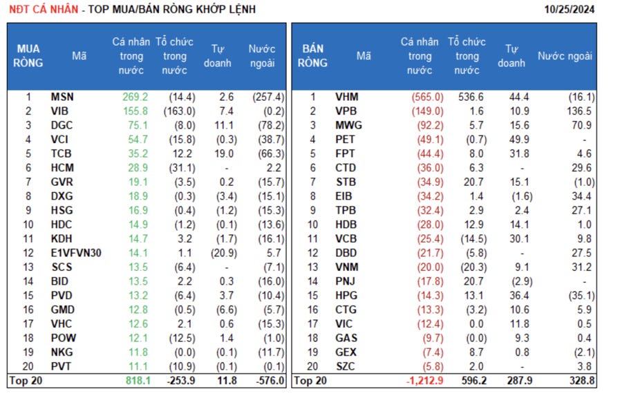 Tính riêng giao dịch khớp lệnh, họ mua ròng 9/18 ngành, chủ yếu là ngành Thực phẩm và đồ uống. Top mua ròng của nhà đầu tư cá nhân tập trung gồm: MSN, VIB, DGC, VCI, TCB, HCM, GVR, DXG, HSG, HDC.