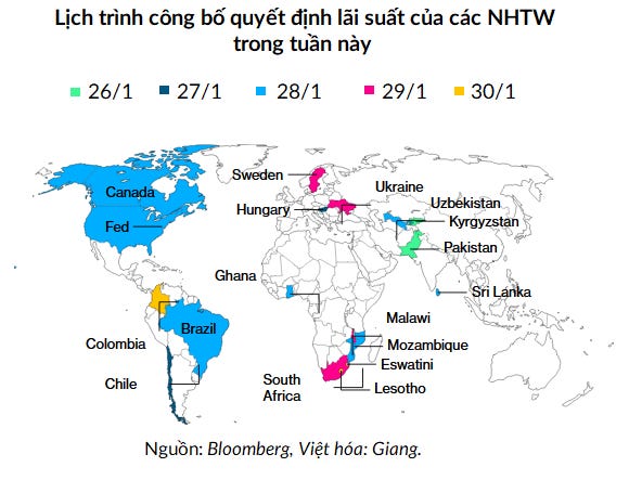 Ngoài Fed, trong tuần này 17 NHTW khác sẽ công bố quyết định về chính sách tiền tệ. Tuy nhiên, trái ngược với Fed, các NHTW ở châu Phi có thể sẽ khởi động làn sóng nới lỏng lãi suất, tờ Bloomberg cho hay.