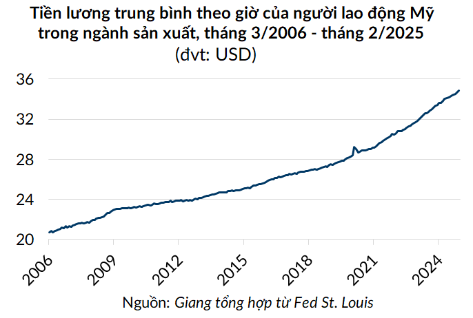 Dựa theo chuỗi dữ liệu dài nhất mà Cục Dự trữ Liên bang Mỹ (Fed) chi nhánh St. Louis thu thập được, tiền lương trung bình của lao động ngành sản xuất Mỹ đã nhảy vọt từ 20,7 USD/giờ vào đầu năm 2006 lên 34,8 USD/giờ vào tháng 2/2025, tăng hơn 68%.