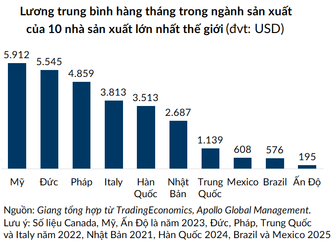 Theo tổng hợp của ông Torten Slok, kinh tế trưởng của công ty quản lý tài sản Apollo Global Management, tiền lương của người lao động trong ngành sản xuất Trung Quốc chỉ bằng 20% các đồng nghiệp ở Mỹ. Thậm chí tiền lương ở Ấn Độ chỉ bằng 3%.