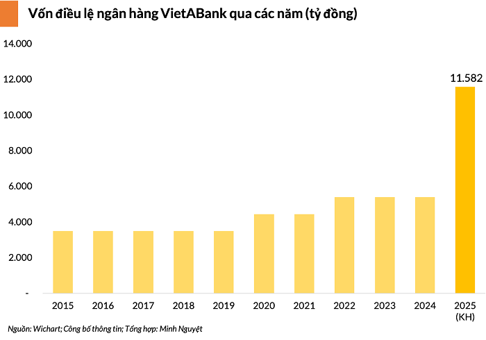 Sau khi thực hiện xong phương án chia cổ phiếu thưởng cho cổ đông tỷ lệ 51,19%, VietABank cho biết đang triển khai tiếp kế hoạch tăng vốn điều lệ thêm hơn 38% trong năm 2025.