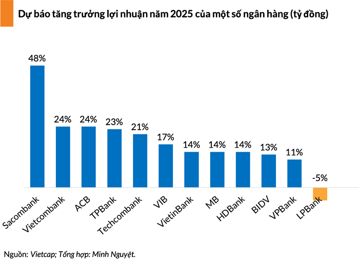 Vietcap dự báo tăng trưởng lợi nhuận năm 2025 của một số ngân hàng như Sacombank (tăng 48%), Vietcombank và ACB (cùng tăng 24%), theo sau đó là TPBank (tăng 23%), Techcombank (tăng 21%). Các ngân hàng như VIB, VietinBank, MB, HDBank, BIDV, VPBank đều tăng trên 10%. LPBank là ngân hàng duy nhất có dự báo tăng trưởng lợi nhuận giảm trong năm 2025.