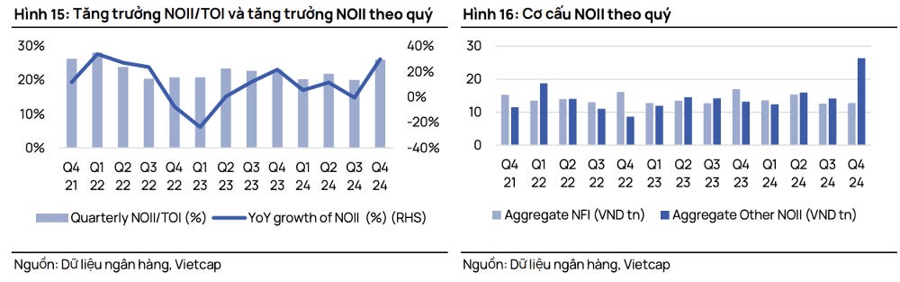 Ngoài thu nhập lãi thuần, thu nhập ngoài lãi cũng tăng trưởng mạnh với 46,1% trong quý IV/2024, chủ yếu được thúc đẩy bởi lãi từ đầu tư và lãi từ giao dịch ngoại hối và thu nhập từ thu hồi nợ mạnh mẽ tại các ngân hàng.