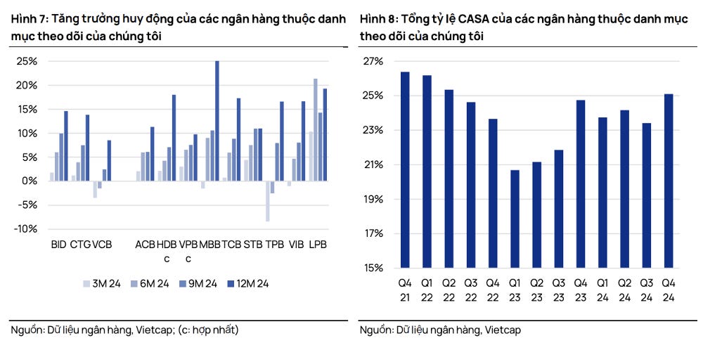 Kể từ giữa năm 2024, các ngân hàng đã dần tăng lãi suất tiền gửi để thu hút tiền gửi của khách hàng, nhưng lãi suất tiền gửi vẫn ở mức tương đối thấp vào cuối năm 2024. Tỷ lệ CASA tổng hợp của các ngân hàng mà chúng tôi theo dõi đã cải thiện 1,7 điểm % lên 25,1% trong quý IV/2024 và gần như đi ngang so với cùng kỳ năm trước, một phần là do nhu cầu thanh toán cao hơn trong mùa cuối năm.