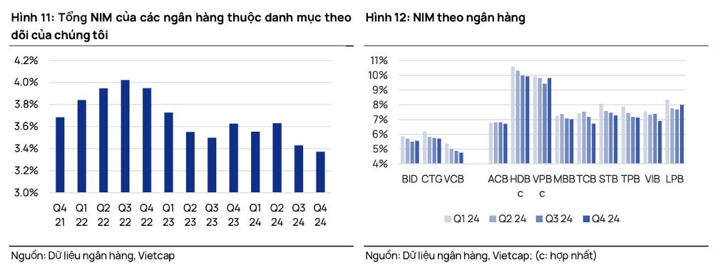 Cụ thể, biên lãi thuần (NIM) của các ngân hàng bị thu hẹp trong quý IV/2024 khi giảm xuống 3,37%, đánh dấu mức NIM hàng quý thấp nhất trong ba năm qua. Phần lớn các ngân hàng (trong danh sách theo dõi) đều báo cáo NIM giảm so với quý trước, ngoại trừ LPBank VPBank và BIDV với áp lực lên lợi suất tài sản sinh lãi (IEA) và chi phí huy động.