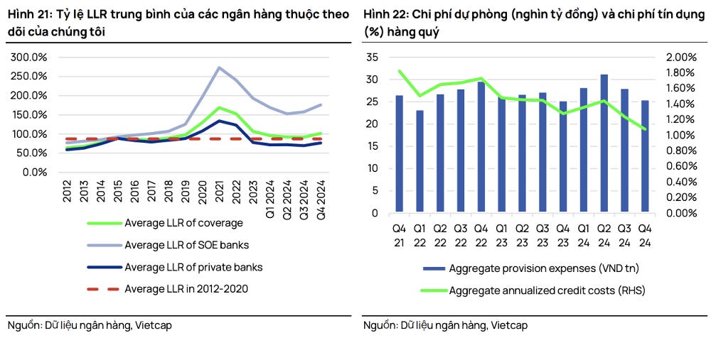 Ở góc độ thận trọng, các chuyên gia Vietcap dự báo chi phí tín dụng năm 2025 sẽ giữ mức cao tương đương cùng kỳ dựa theo kỳ vọng chi phí tín dụng quý IV/2024 thấp do một số ngân hàng hoàn nhập chi phí dự phòng một lần. Ngoài ra, báo cáo Vietcap dự phóng các ngân hàng sẽ tiếp tục tăng cường bộ đệm dự phòng vào năm 2025.