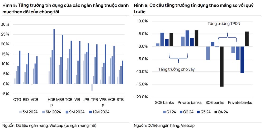 Theo Vietcap, một số ngân hàng báo cáo tăng trưởng tín dụng vượt trội, bao gồm HDBank (27,3%), MB (24,7%), Techcombank (21,7%), LPBank (20,4%) và ACB (19,1%), hầu hết đều có lợi thế cạnh tranh trong mảng cho vay doanh nghiệp hoặc chi phí vốn thấp.