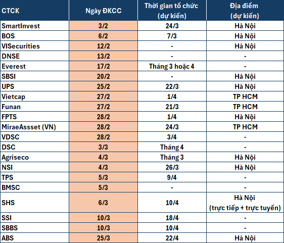 Tính từ đầu năm đến sáng 17/2, có 21 công ty chứng ty chứng khoán đầu tiên đã công bố kế hoạch tổ chức và ngày chốt quyền tham dự ĐHĐCĐ thường niên 2025.