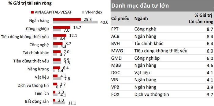 Ngân hàng vẫn chiếm tỷ trọng lớn nhất với 25,3%, kế đến là công nghiệp 15,7%, tiêu dùng không thiết yếu 12,1%, công nghệ 8,7%... Top 10 khoản đầu tư chiếm tỷ trọng lớn nhất bao gồm: FPT, ACB, BVH, MWG, GMD, MBB, DGC, VIB, VPB, FOX.