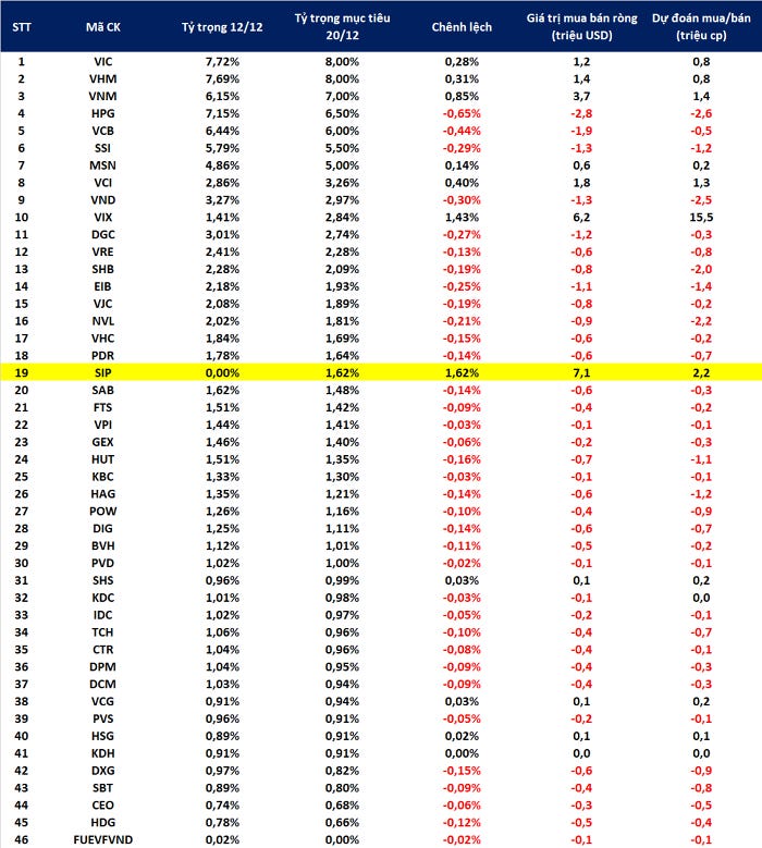 Tại ngày 13/12, quy mô danh mục VNM ETF đạt gần 438 triệu USD (khoảng 11.000 tỷ đồng). Với tỷ trọng 1,62%, quỹ dự kiến sẽ mua mới 2,2 triệu cổ phiếu SIP. Bên cạnh đó, VNM ETF sẽ mua thêm một số cổ phiếu với khối lượng lớn như VIX (15,5 triệu cp), VNM (1,4 triệu cp), VCI (1,3 triệu cp)…