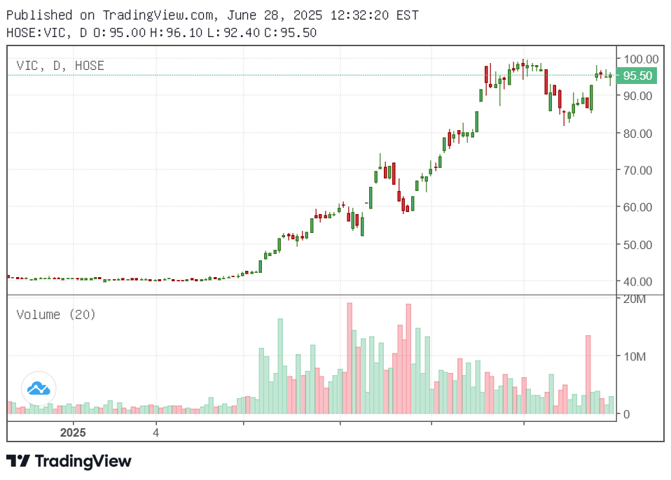Vinhomes (VHM) cũng không kém cạnh với vốn hóa tăng 152 nghìn tỷ đồng, tăng 92,5% đưa vốn hóa lên hơn 316 nghìn tỷ đồng, là doanh nghiệp có vốn hóa lớn thứ 3 toàn thị trường sau Vietcombank và Vingroup. Ngoài ra, Vincom Retail (VRE) ghi nhận vốn hóa tăng thêm 17 nghìn tỷ đồng, tăng 45% trong gần nửa đầu năm 2025.