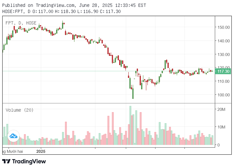 Tuy nhiên, không phải doanh nghiệp nào cũng duy trì được đà tăng. Một số tên tuổi lớn đã chứng kiến sự sụt giảm vốn hóa đáng kể. FPT ghi nhận vốn hóa giảm gần 51 nghìn tỷ đồng, từ 224 nghìn tỷ đồng xuống 174 nghìn tỷ đồng, giảm gần 23%, là doanh nghiệp có vốn hóa giảm mạnh nhất sàn HoSE. FPT hiện đang là doanh nghiệp có vốn hóa lớn thứ 7 sàn HoSE.