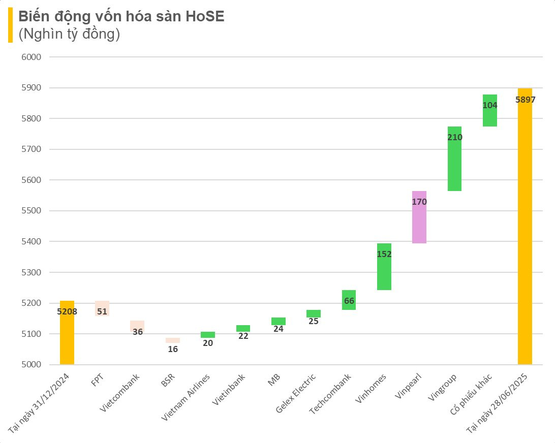 Tổng vốn hóa thị trường trên Sàn Giao dịch Chứng khoán TP.HCM (HoSE) đã tăng trưởng mạnh mẽ trong nửa đầu năm 2025, đạt gần 5,9 triệu tỷ đồng vào ngày 28/6/2025, tăng khoảng 690 nghìn tỷ đồng, tương ứng tăng 13% so với mức hơn 5,2 tỷ đồng vào cuối năm 2024.