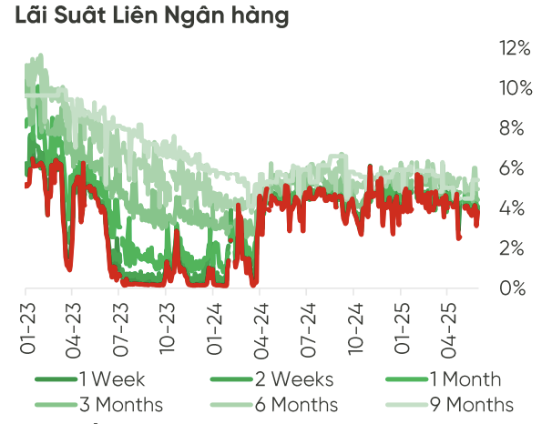 Từ đầu tháng 4 đến hết tháng 5, lãi suất trên thị trường liên ngân hàng tiếp tục nằm ở vùng thấp, phản ánh thanh khoản dồi dào trong hệ thống và mục tiêu duy trì mặt bằng lãi suất thấp của NHNN.