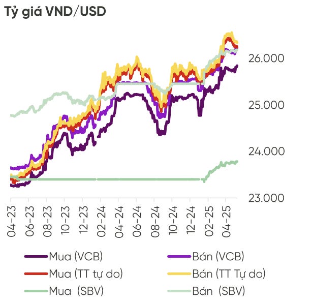 Dù đồng USD trên thị trường quốc tế đã hạ nhiệt, tỷ giá USD/VND tại ngân hàng vẫn giữ xu hướng tăng. Tại Vietcombank, tỷ giá trong tháng 5 duy trì ổn định trong biên độ 25.700–25.840 VND/USD (chiều mua) và 26.090–26.230 VND/USD (chiều bán). So với đầu năm, tỷ giá tại đây đã tăng từ 2,45% đến 2,66%.