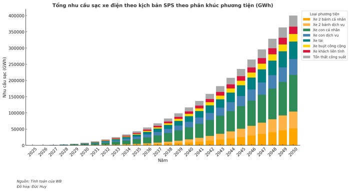 Báo cáo dự đoán đến năm 2030, xe hai bánh vẫn sẽ là lực lượng chính trong đội quân xe điện tại Việt Nam. Nhưng tiềm năng thực sự nằm ở tương lai xa hơn. Đến năm 2050, nếu Việt Nam theo kịch bản SPS (Sustainable Policy Scenario), lượng dầu thô tương đương tiết kiệm được sẽ là 4.502 thùng; còn theo kịch bản ADS (Accelerated Decarbonization Scenario), con số nhảy vọt lên 6.224 thùng.