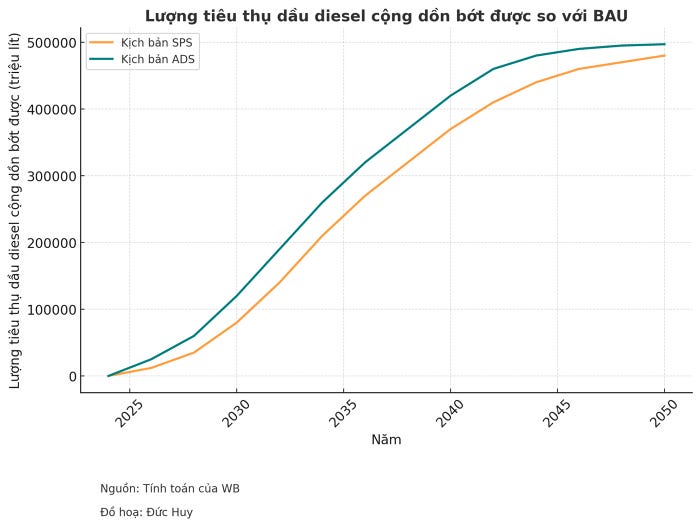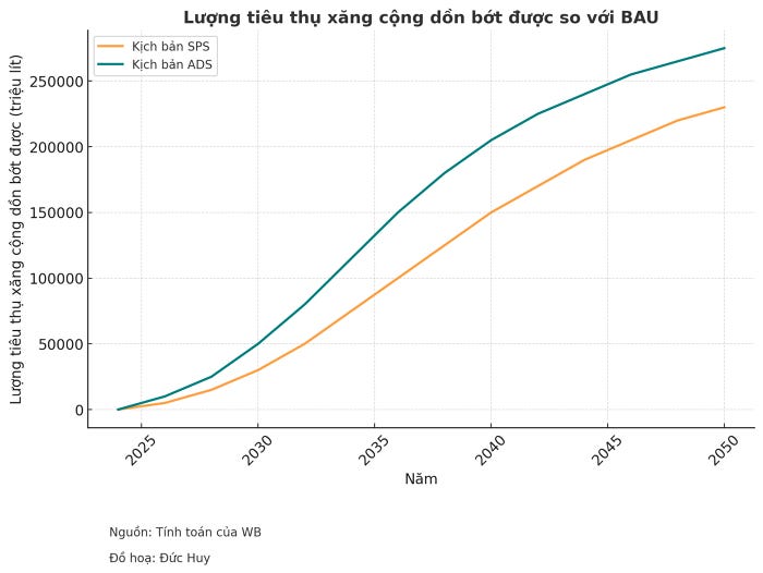 Với giá dầu quốc tế 80 USD/thùng, điều này tương đương 360 tỷ USD (SPS) hoặc 498 tỷ USD (ADS) không phải chảy ra nước ngoài để mua xăng dầu . Đó là số tiền đủ để xây hàng nghìn cây cầu, trường học, hay nhà máy - tất cả chỉ bằng cách thay đổi phương tiện chúng ta sử dụng.