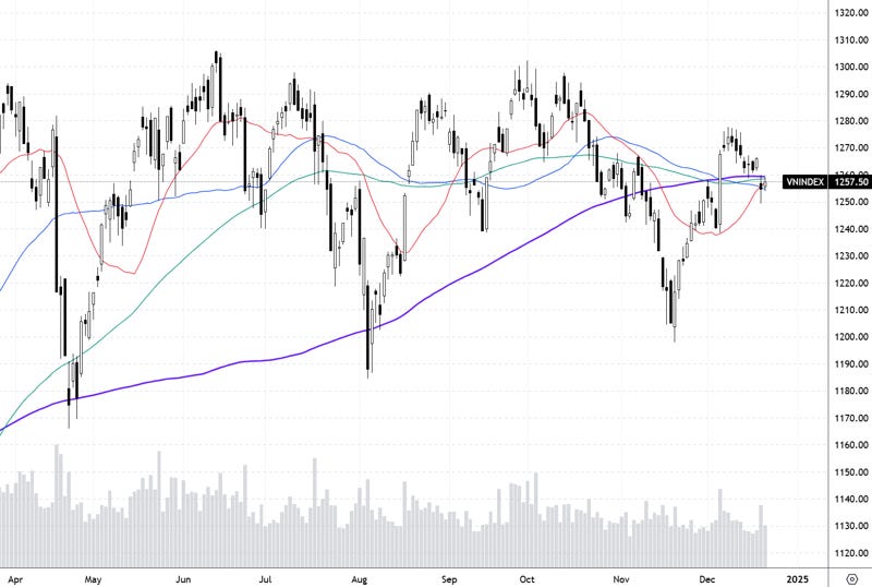 VN-Index cũng đã có dấu hiệu đứng vũng trên vùng hỗ trợ 1250 – 1255 và vẫn có cơ hội phục hồi trở lại khu vực 1280 – 1300 điểm trong giai đoạn cuối cùng của tháng 12. Diễn biến của nhiều cổ phiếu ngành cơ bản cũng là khả quan. Tôi vẫn tiếp tục kỳ vọng vào một đợt hồi phục giai đoạn ở các phiên giao dịch cuối của năm 2024.