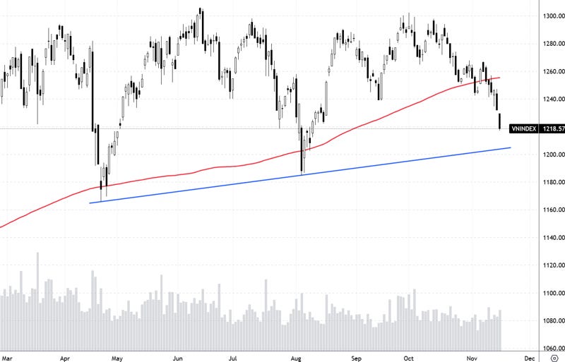 3 phiên giao dịch đầu tuần thị trường liên tục thử thách vùng hỗ trợ 1200 điểm, thậm chí còn có nhịp xuyên thủng mức này trước khi phục hồi trở lại. Tuần trước anh chị chờ đợi thêm diễn biến giao dịch để xác nhận trạng thái “wash-out”. Thanh khoản trong nhịp kiểm định 1200 điểm lại không cao, trừ phiên ngày 20/11. Anh chị nhận định thế nào về diễn biến “test” đáy này?