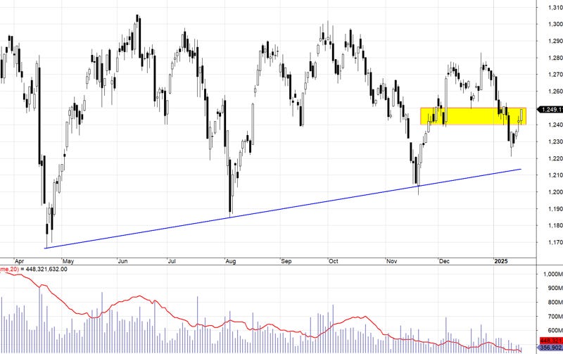 Hiện tại, vùng 1250 – 1260 điểm đang là ngưỡng cản ngắn hạn, đồng thời thanh khoản trong nhịp hồi không cao, nếu nhìn ở khung tuần thì khớp lệnh vẫn thấp hơn tuần giảm điểm trước đó. Tuy nhiên cũng không loại trừ giao dịch trầm lắng do gần kỳ nghỉ Tết. Vậy nên, sự xác nhận đáy tôi kỳ vọng xảy ra khi thị trường tiếp tục ổn định trên khu vực 1240 điểm hoặc tăng tiếp ở các phiên tới, nhưng nếu có tín hiệu đảo chiều thủng dưới ngưỡng này thì quán tính giảm sẽ quay lại.