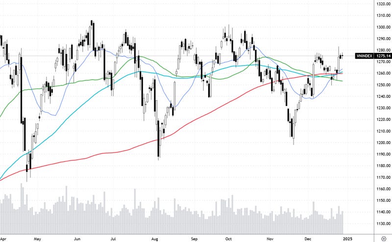Theo tôi thanh khoản chưa cải thiện nhiều, trừ phiên 25/12, cũng dễ hiểu, đây là phản ứng chậm lại và có phần thận trọng của nhà đầu tư khi thị trường tăng điểm và hướng đến vùng 1280 - 1300 điểm, vùng có diễn biến phân phối ngắn hạn trong quá khứ.