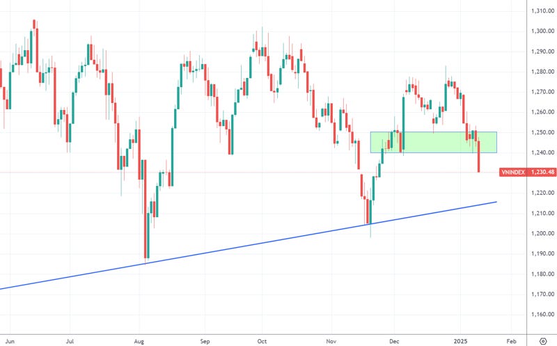 Tuần qua thị trường cũng đón nhận số liệu vĩ mô quý 4 và cả năm 2024 khá tích cực. Tuy nhiên ngay đầu tuần thị trường đã giảm mạnh và sau đó giao dịch yếu để rồi cuối tuần lao dốc nặng hơn. Thị trường dường như phản ứng ngược với thông tin hỗ trợ. Vì sao tâm lý nhà đầu tư lại yếu như vậy? Anh chị có nhìn thấy yếu tố bất lợi nào?