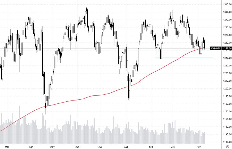 Thị trường đã chứng kiến một tuần giảm tiêu cực, đặc biệt giảm mạnh trong hai phiên cuối tuần xuyên thủng đáy 1240, rơi về vùng hỗ trợ tiếp theo ở 1185-1220. Mặc dù phiên cuối tuần đi kèm khối lượng giao dịch tăng lên cao cho khả năng có thể bắt đầu có tiền vào đỡ, nhưng hành động giá chưa thể hiện rõ điều này. Tôi nghĩ sẽ cần chờ thêm. Nếu thị trường tiếp tục có thêm phiên giảm mạnh kèm khối lượng tăng cao hơn, đồng thời thấy rõ hơn sự hoảng loạn trong phiên và nến rút chân trở lại (hoặc hồi phục nhanh ngay phiên sau đó) thì sẽ ủng hộ khả năng “washout”, khi đó có thể sẽ sớm có một đáy hồi phục ngắn trở lại.